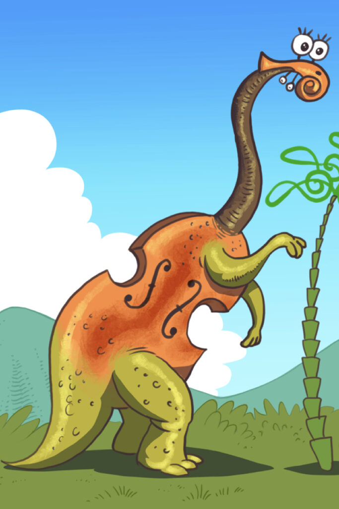 By m. 97, our dinosaur hero is feasting on the wind-inducing fauna with wild abandon, as the orchestra plays a sort of loud, drunken waltz. There’s one more big windy release at m. 111, and at mm. 116-117, a comic pause for effect, and then a non-tonal squeak of a singing release by the trumpet buzzing into a mouth-piece.